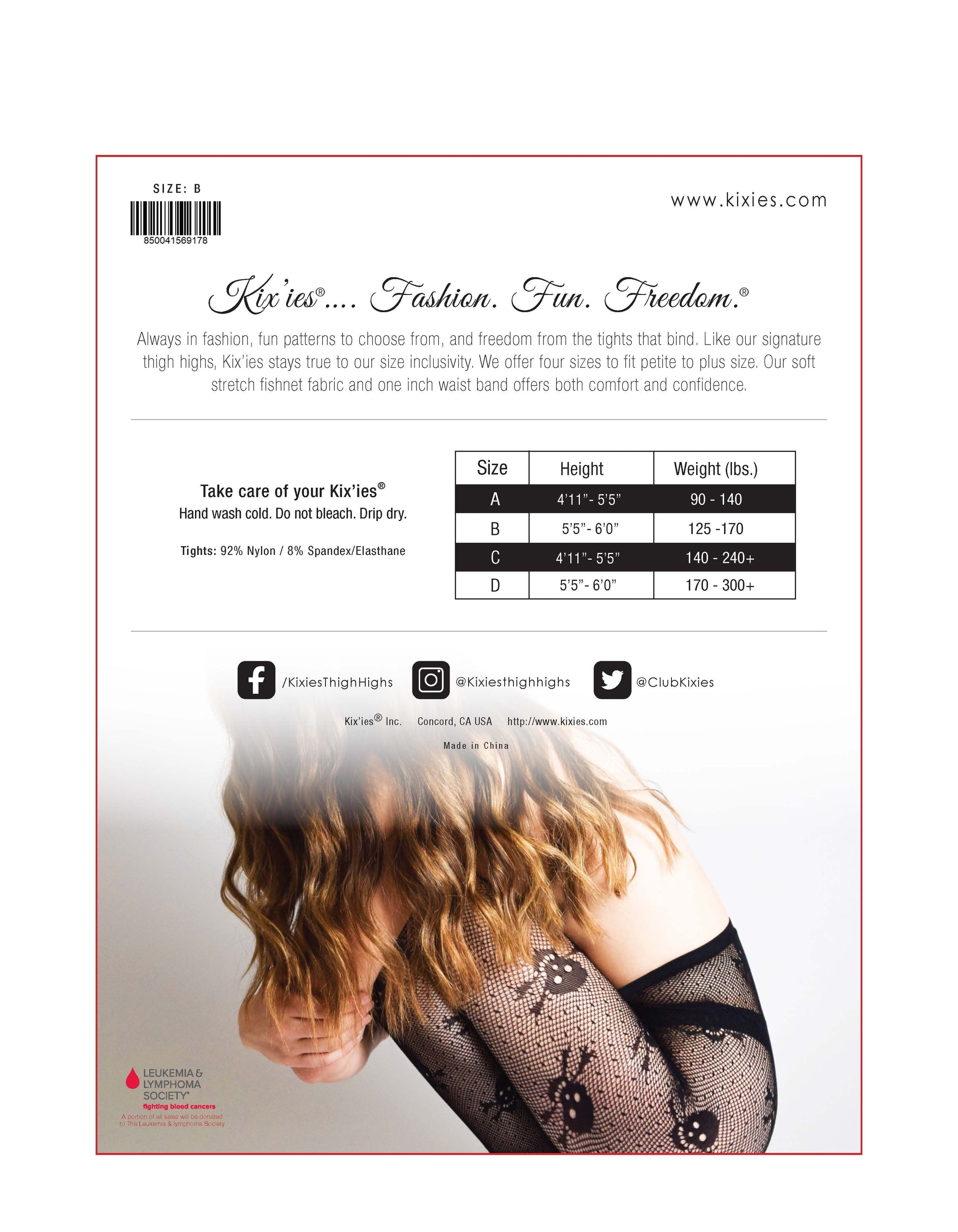 Like our signature thigh-highs, Kix'ies stays true to our size inclusivity. We offer four size options from petite to plus size tights. Our soft stretch fishnet fabric and one inch waist band offer both control and confidence.