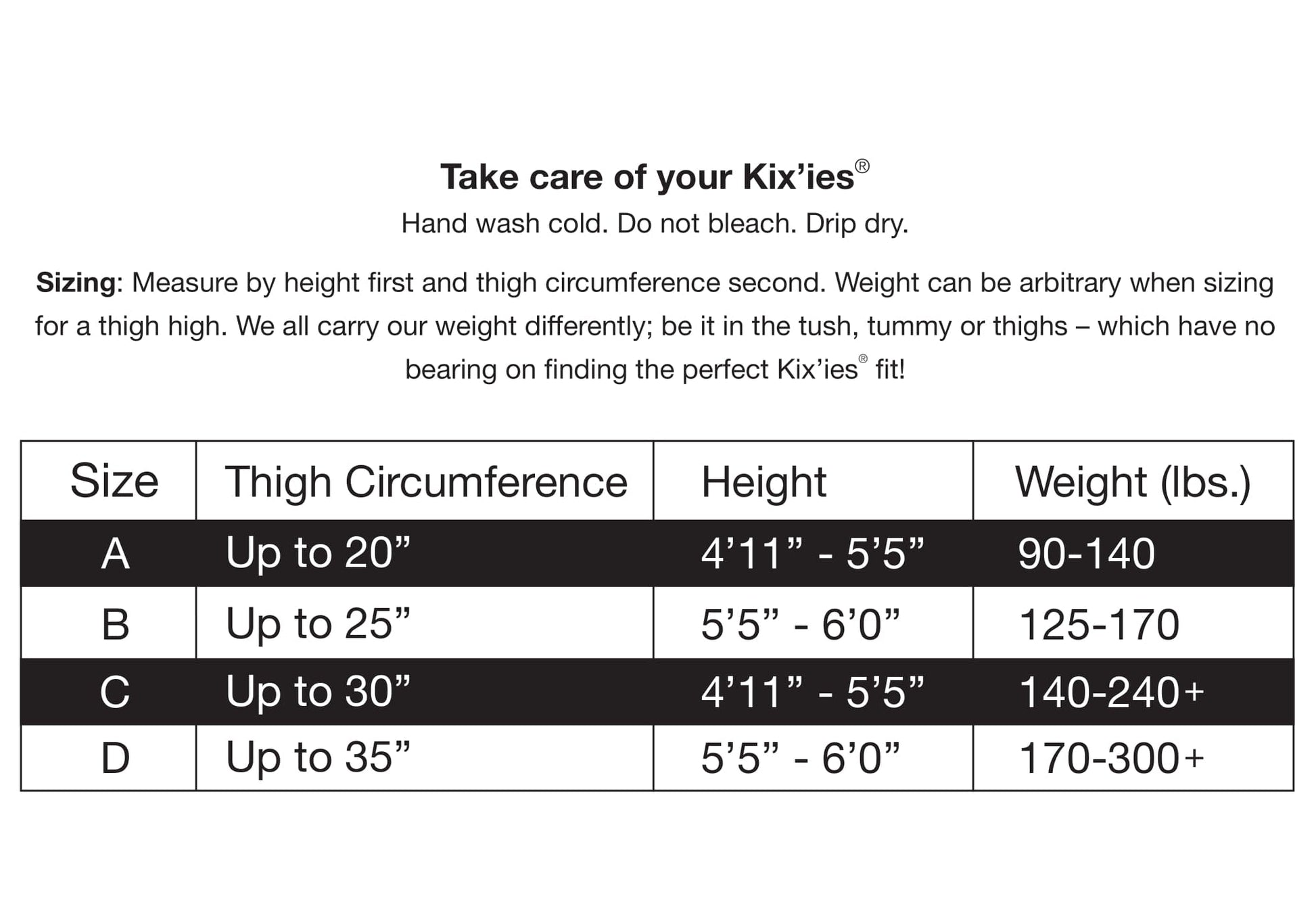 Sizing: Measure by height first and thigh circumference second. Weight can be arbitrary when sizing for a thigh-high. We all carry our weight differently; be it in the tush, tummy or thighs – which have no bearing on finding the perfect Kix’ies® fit! Time to kick those binding tights and outdated hosiery to the curb!