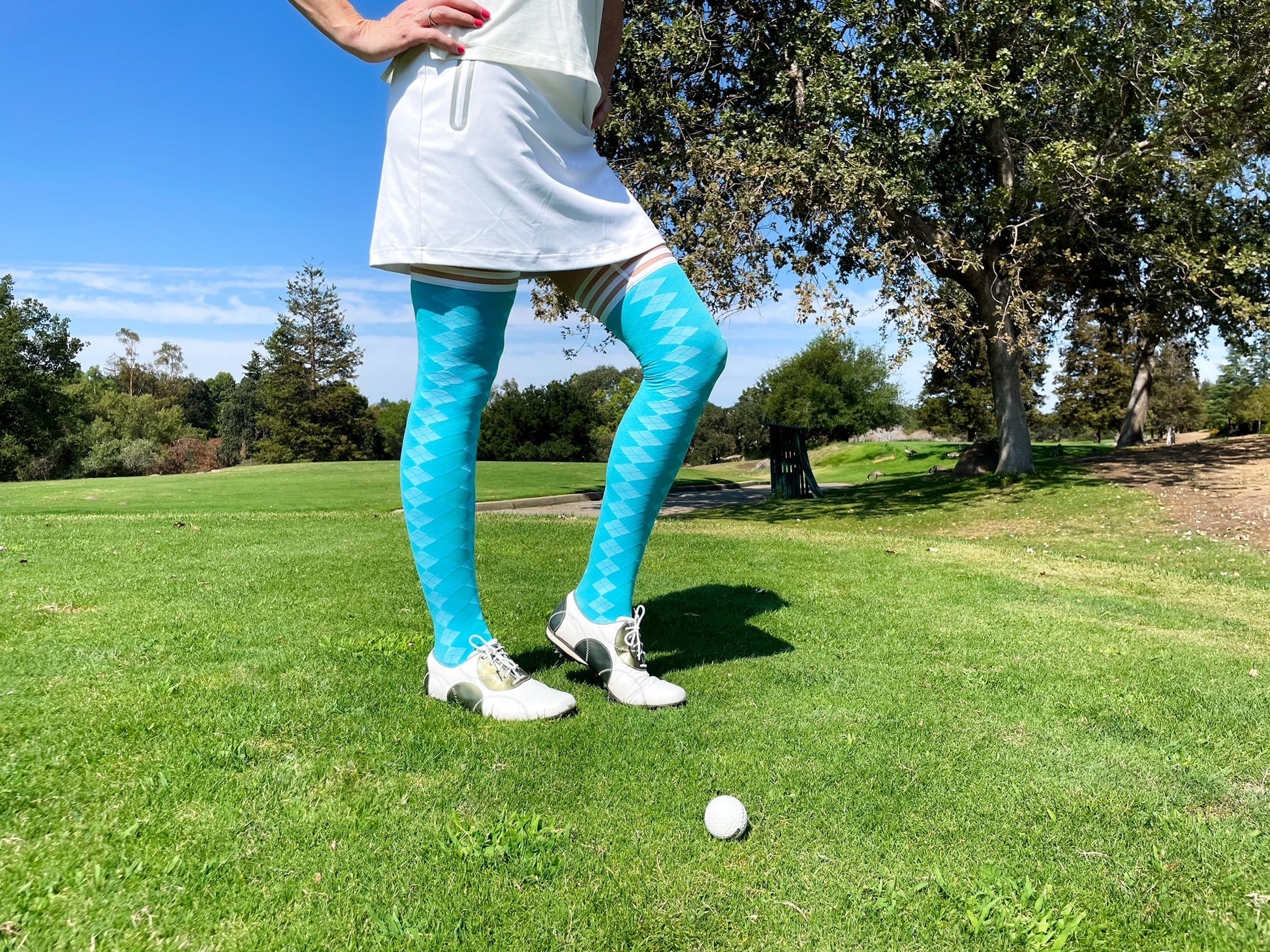 Kix'ies Golf Collection Teal Thigh-High Stockings. Add a little bit of extra flair to your golf outfits with the help of our opaque argyle print, thigh-high stockings! Kix'ies thigh-highs are designed for all-day wear, with a no-slip-grip. We offer Petite to Plus Size Stockings and are the #1 thigh-highs that actually stay up!